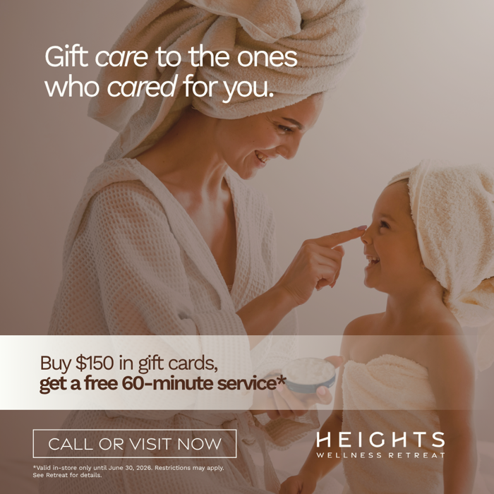 *Valid in-store only until June 30, 2026. Free 1-hour massage or facial service issued as a gift certificate (“Free Service Certificate”). Limit of 2 Free Service Certificates per person. Gift Cards may not be purchased using service credits or in combination with other discounts. Gift Cards may be used to purchase services and retail products, may not be used to pay recurring monthly dues, do not expire, and must be presented at time of redemption; except as required by law, are not refundable or redeemable for cash. Free Service Certificates expire September 30, 2026; are redeemable only at location where issued; cannot be used to purchase products, be applied to gratuity, or redeemed for prenatal, HydraFacial, ProPower Peel, Microdermabrasion services. One Free Service Certificate redeemable per visit. Heights is not responsible for lost or stolen Gift Cards or Free Service Certificates. Rates and services may vary by location. Additional local taxes and fees may apply. Service times include up to 10 minut